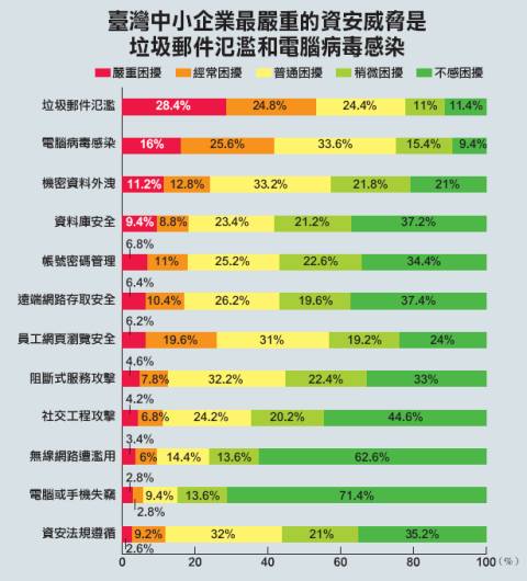 2009年臺灣中小企業感到嚴重困擾和經常困擾的資安威脅就是垃圾郵件氾濫(53.2%)、電腦病毒感染(41.6%)以及機密資料外洩(24%)。
