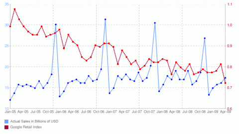例如Google的奢侈品指標追蹤的是使用者所輸入的珠寶、戒指、鑽石或其他相關的搜尋字串,發現其搜尋量與這兩年全球經濟衰退現象相符,呈現急速下滑;另一個失業指標則是追蹤失業、社會安全、失業福利等搜尋字串,其搜尋量自去年年底開始大幅上揚。