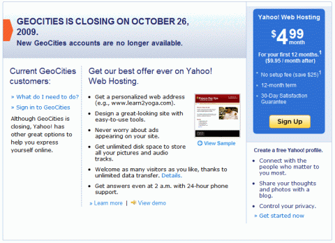 不過,Yahoo似乎不願再維護免費的網頁代管,於今年初就不再接受新的GeoCities用戶註冊,而今在GeoCities的首頁上,Yahoo開始推薦使用者升級到付費的Yahoo! Web Hosting服務,它提供個人化的網域名稱以及無限的硬碟空間,月費為4.99美元。