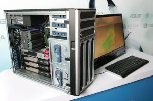 ESC1000伺服器外觀與華碩高階直立式伺服器幾乎一模一樣,採用1顆英特爾Xeon處理器,特別的是,伺服器內部內含3張Tesla繪圖卡與1張內含繪圖核心的Quadro FX5800顯示卡,因而一臺伺服器就配備了高達968個運算核心,浮點運算量達1,104Gflops。華碩大型企業服務課大型企業服務代表陳青禾表示,傳統的伺服器要達到同樣的運算量,就需要32臺,從這個角度來看可為企業省下電費與機房的空間。