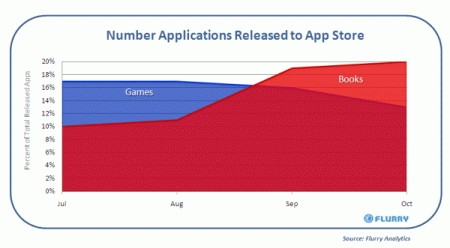 為了要預測iPhone下一個會為媒體和娛樂產業帶來的衝擊,Flurry研究了自App Store成立以來所發佈的應用程式種類。從2008年8月至2009年8月,絕大部分的應用程式都是遊戲類別。但從今年九月開始,Flurry發現,電子書首度超越了遊戲的發行數量。