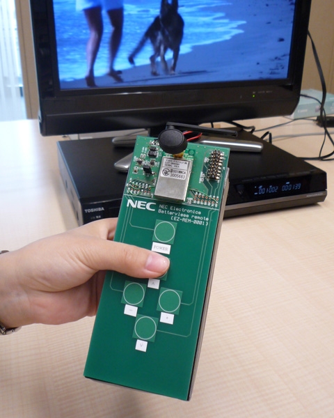 試作的遙控器內配備NEC Electronics可對應無線電射頻(RF)的微電腦,以及只需微弱電力就能驅動遙控器電子迴路的電源控管技術,加上振動力發電技術後,驗證它確實不需電池就能開關電視電源、調節音量與更換收視頻道。