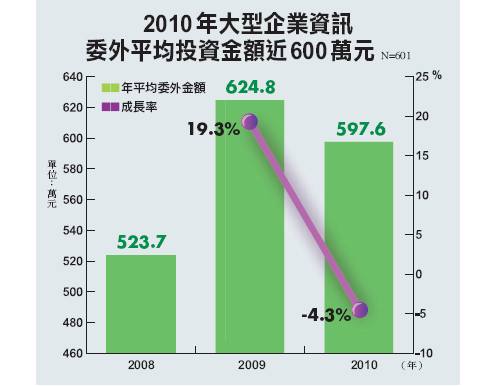大型企業方面,在金融風暴過後,資訊委外的平均投資金額也下降,並且從2009 年的624.8 萬元下降到2010 年597.6 萬元,致使成長率亦從2009年的19.3%驟減到2010年的負4.3%。