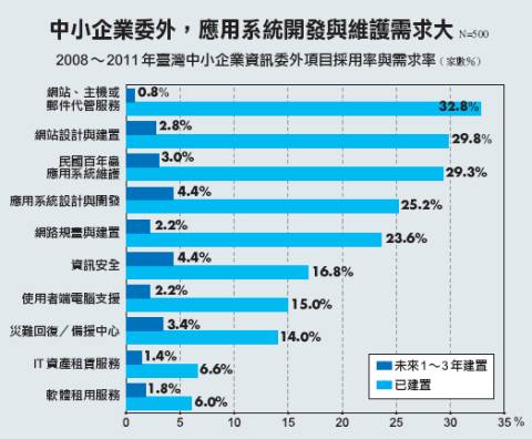 中小企業方面,則以應用系統設計與開發的委外需求最大。翁偉修指出,目前約有3成左右的中小企業,已經把網站、主機/郵件代管服務與網站設計/建置等資訊需求委外,未來3年內的委外需求,除了一般的應用系統設計與開發之外,關於「民國百年蟲」的應用系統維護也很殷切。