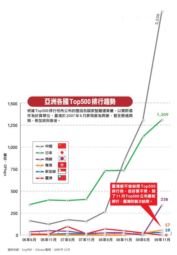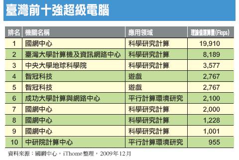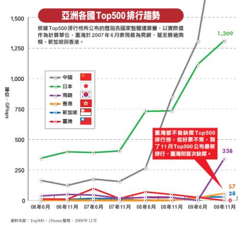 超級電腦的運算量攸關一個國家的學術與研發能力,在最新出爐的Top500全球500大超級電腦排行榜單,臺灣再次退出榜外,同時國家網路與計算中心(國網中心)的高速計算共用研究平臺報告也出爐,指出2011年臺灣學術研究需要243TeraFlops的運算量,但目前臺灣前30強超級電腦的總運算量僅48.6TeraFlops,因此總體運算量必須成長5倍,才能滿足2011年的運算需求。目前國網中心正向國科會提報希望在2011年能建置完成200TeraFlops的超級電腦,國網中心副主任黃維誠說:「臺灣目前能提供的超級電腦運算量,已經不能滿足學術研究的需求,如果不能完成新一代超級電腦的建置,到了2011年需求的落差將會更大,將影響到未來臺灣學術研究的發展。」