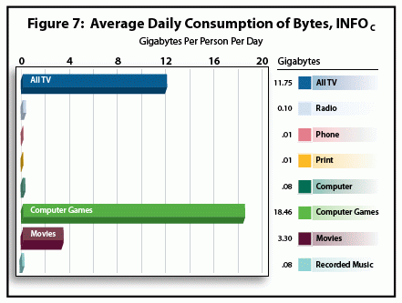 若以資訊量來計算,電腦遊戲則佔了最大的資訊來源,約佔美國人每天所消費資訊的54%,為18.5GB。該報告的作者Roger Bohn表示,遊戲非常普及,但大部份的遊戲位元消費來自於高階電腦及遊戲機上的圖像遊戲。