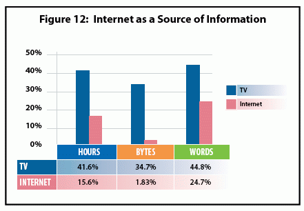 美國人消費資訊的時間以看電視為最大宗,估計有41%的時間是在看電視,包括DVD、錄影電視及即時節目。此外,美國人每月在行動裝置上看電視的時間為3600萬個小時,並可望持續成長。
