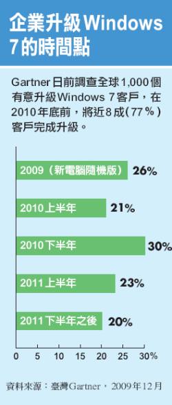 根據Gartner一份針對全球1千個,有意升級到Windows 7的客戶調查,在2009年已有近3成(26%)企業陸續升級Windows 7,2010年則有過半(51%)企業有意升級。