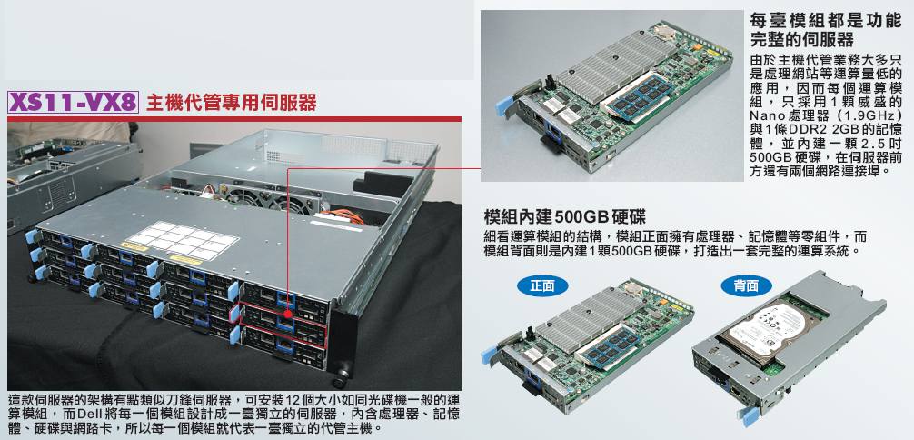 Dell針對主機代管業者設計的XS11-VX8伺服器則更為特別,這款伺服器的架構有點類似刀鋒伺服器,可安裝12個大小如同光碟機一般的運算模組,而Dell將每一個模組設計成一臺獨立的伺服器,內含處理器、記憶體、硬碟與網路卡,所以每一個模組就代表一臺獨立的代管主機。這個產品與刀鋒伺服器不同之處在於,刀鋒伺服器是共同網路與電源,但XS11-VX8的每一個模組都有獨立的網卡,只共用電源而已。