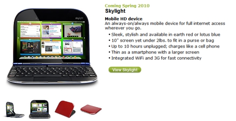 聯想表示,Skylight結合了智慧型手機與小筆電的特性,具有輕薄流線的外型設計,可使用一整天的電池壽命,以及強大的無線上網功能,將能為消費者帶來新的行動上網體驗。Skylight將搭配美國AT&T 3G行動寬頻服務。