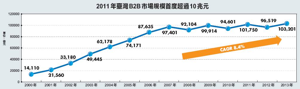 資策會產業支援處研究員高幸玉表示,臺灣的B2B產業規模會隨著大環境景氣而變化,隨著製造業、資訊業、兩兆雙星產業在2012年、2013年的復甦,以及電子商務本身的發展,也刺激B2B產業規模提升。根據統計,2008年至2013年年複合成長率(CAGR)8.4%來看,2011年臺灣B2B電子商務市場規模將首度突破10兆元(10兆1,750億元),到2013年市場規模高達10兆3,201億元。
