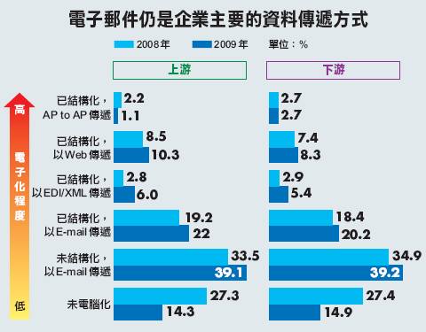 根據經濟部商業司委託資策會針對上、下游產業進行的調查,在2009年,有超過6成(61.1%)的企業,其資料傳遞方式仍以電子郵件為主。