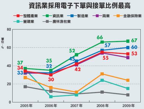 若以資訊業(包含資訊、3C製造業)、製造業、商業、金融保險業、營建業和農林漁牧業等6大產業的電子交易方式來看,資訊業採用電子下單和接單的交易方式比例最高,以2009 年為例,產業整體平均有5 成(53 %)採用電子交易,採用電子交易高於產業平均的產業分別是資訊業(67%)和製造業(60%)。