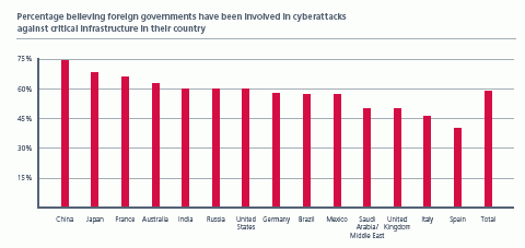 不同領域所擔心的侵略國家也不同,例如在政府領域的IT人員最擔心來自中國政府的攻擊,在能源領域的IT人員最擔心來自俄國的攻擊,電信領域的IT人員則擔心來自美國與中國的攻擊。