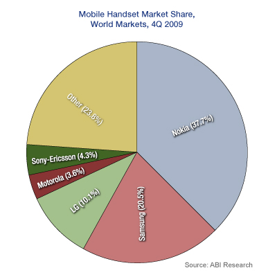 ABI表示,三星由於同時具有完備的功能手機產品線以及創新的智慧型手機產品,它的市佔率已從2008年6月的15.2%成長到2009年12月的20.5%。而近來表現優異的LG,則受惠於其S系列智慧型手機穩住市場地位。這兩家公司的成功,已讓韓國業者在手機市場的影響力與日俱增。