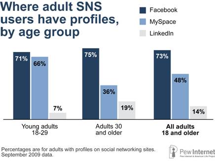 持續受到歡迎的則是Facebook等社交網路。調查發現有73%的美國青少年使用社交網站,從2006年的55%成長到去年的73%;使用社交網站的年輕人比例也與青少年相近,達到72%。然而,整體成年網友參與社交網站的比例亦增加,自2008年的37%成長到去年的47%。