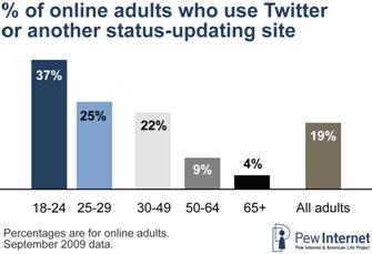 使用Twitter或其他微型部落格的成年網友比例為19%。其最大族群為18~24歲,該年齡層有37%使用Twitter,25~29歲族群有25%,30~49歲族群有22%,50歲以上使用Twitter的比例則不到10%。