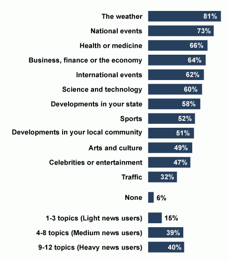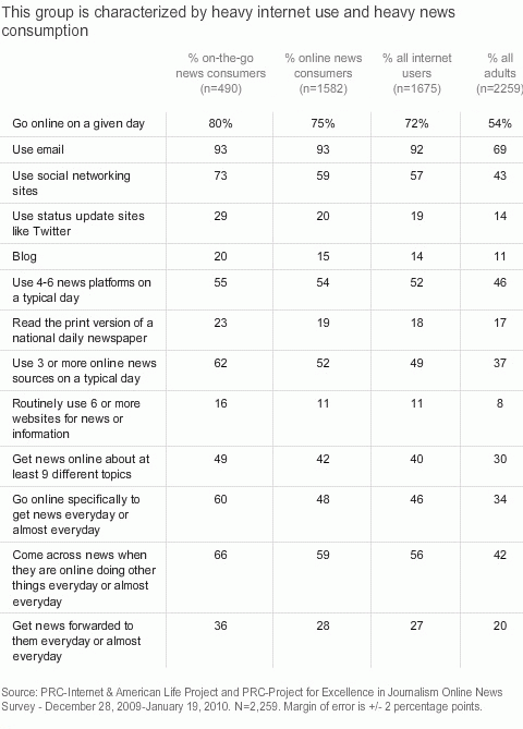 例如,有33%手機使用者利用手機看新聞,28%網路閱報者的個人首頁會針對各種不同議題的新聞來源個人化,37%的使用者會參與新聞的創作與回應,或者是利用Facebook及Twitter等社交網站幫忙傳播新聞。