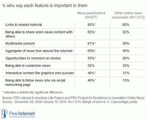 ↓ 習慣參與網路新聞(寫作/回應)的讀者,對於新聞網站的一些功能也比一般讀者更加在意,例如,他們希望能夠提供原始新聞資料的連結(80%-60%),能夠與他人分享(63%-32%),提供多媒體內容(61%-38%)