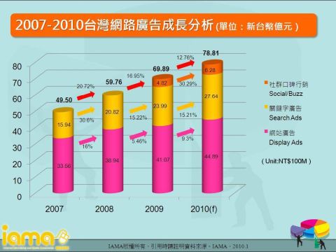 IAMA的統計是依旗下網路廣告會員進行調查,以統計去年國內網路廣告整體市場表現狀況,去年國內網路廣告營收相較於2008年的59.76億元成長16.95%,達到69.89億元。IAMA預估2010年國內網路廣告營收將達到78.81億元。