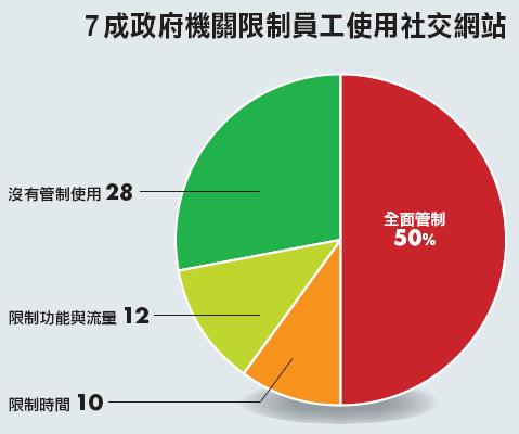 行政院主計處在去年12月,針對臺灣168個政府機構調查,其中,200人以上的機構將近7成(67.9%),200人以下的機構為3成(32.1%)。從該份調查結果中發現,有超過8成(85%)的政府機構清楚使用社交網站可能為機關帶來的風險,因此,政府機構對於員工使用社交網站普遍採取管制,只有不到3成(28%)機關是不限制員工使用,有50%是全面管制使用社交網站,22%則是採取部分管制。