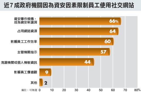 政府機關限制員工使用社交網站最主要的原因,是擔心員工使用社交網站會造成資安新漏洞。