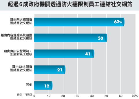 至於,多數政府機構限制員工使用社交網站的方式,超過6成(62%)是藉由防火牆阻擋連結到社交網站,其次,則有5成是藉由內容過濾系統阻擋連結到社交網站,第三則是透過資安規範、加強對員工稽核(41%),採用DNS阻擋連結到社交網站的比例則只有2成(21%)。