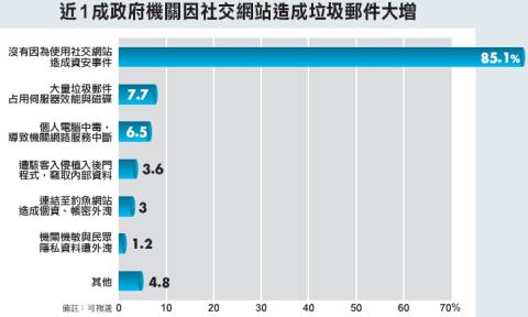 不過,從該份調查整體看來,超過8成(85.1%)的政府機構,並未曾因為員工使用社交網站造成資安事件,但有7.7%的機關曾遇到大量垃圾郵件占用伺服器效能與磁碟,因為使用社交網站導致個人電腦中毒、機關網路服務中斷的比例則有6.5%,其他包括連結到惡意網站導致個資、帳號密碼遭竊,以及機敏機關與民眾隱私資料外洩的比例將近5%(4.2%)。