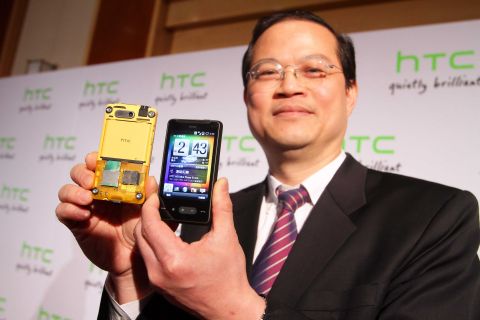 HTC亞太區副總經理董俊良展示HD mini,採用Windows Mobile 6.3.5平台,手機螢幕為3.2吋,打開手機背蓋後手機背後為亮黃色設計。