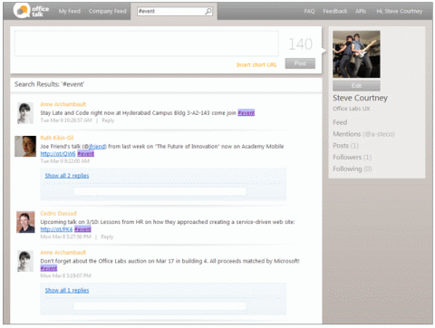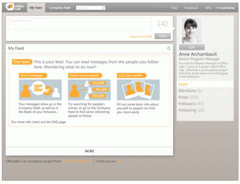 Office實驗室一直在研究社交網路對企業生產力的正面影響,並進行許多實驗,最近的實驗就是OfficeTalk,把微型部落格的基本能力帶到企業環境中,以讓員工能夠張貼自己的想法、活動及對其他人可能有價值的資訊。