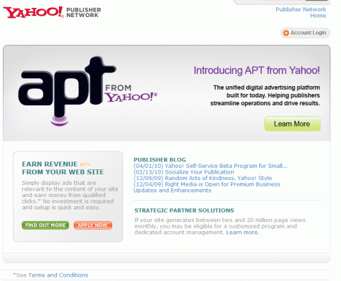 雖然這只是測試計畫,但Yahoo早在2005年就推出該服務,著眼於讓部落格的小型出版商也能透過自助式系統參與Yahoo的廣告出版網路,出版商可根據網站上的內容搭配同質的廣告,並分享廣告利潤。
