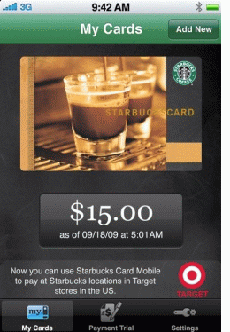 2009年9月在16家門市開始試用手機付費之後,星巴克現在宣佈適用範圍拓展到全美1002家門市,現在用iPhone等智慧型手機即可在至一千多家門市買咖啡。