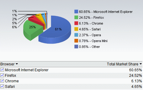Google在2008年9月發表Chrome瀏覽器,以簡潔及快速為產品訴求。根據Net Applications的報告,Chrome市佔率在去年12月超越蘋果Safari後就穩定保持在第三名位置,今年2月Chrome還成為市佔率唯一有所成長的主要瀏覽器。Chrome今年3月的市佔率為6.13%,落後於IE的60.65%及Firefox的24.52%,並領先Safari的4.65%與Opera的2.37%。