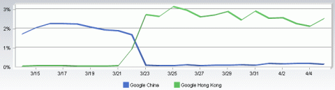 Net Applications也針對Google中國及香港流量的每日消長提出分析,指出在Google將中國流量導向香港後,中國Google流量瞬間接近零,而香港站的流量一度成長到全球使用率的3%。