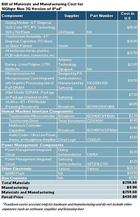 iSuppli拆機報告詳列iPad各零件的成本: