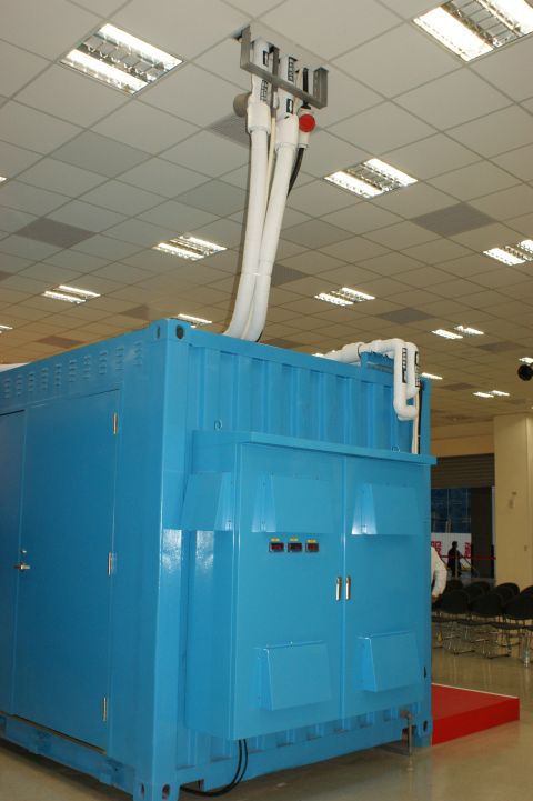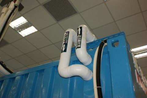 移動式資料中心採用水冷式散熱,從外部接入冷水儲放在貨櫃上方的天花板內。圖為外部接入的輸水管。↓