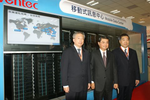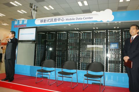英業達董事長李詩欽(圖中)展示研發中的移動式資料中心(Mobile Data Center)原型,為本地業者第一個亮相的貨櫃式資料中心。↓