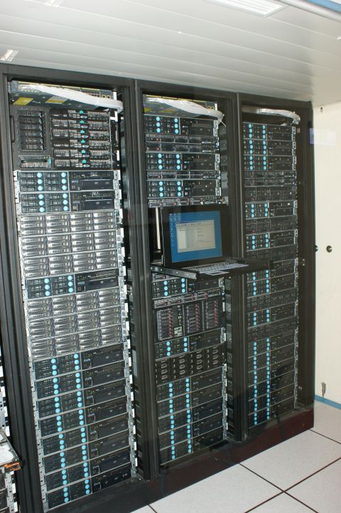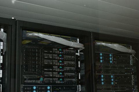 內部機櫃就像一般機房中的機櫃一樣,配備KVM等設備。但為防止火災與震動,英業達表示該貨櫃以防火材質設計,且機櫃下方設計防震裝置。↓