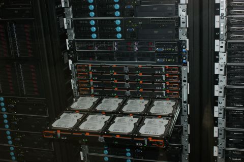 機櫃中儲存系統可彈性選擇使用3.5吋或2.5吋硬碟。↓