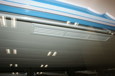 機櫃後方的熱空氣被吸入天花板內以冷水降溫後,再經由機櫃前方的出風口送到前方供機櫃降溫,如此冷熱循環方式降低貨櫃內的溫度。↓