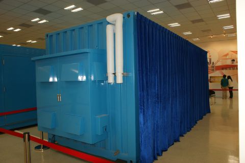 英業達在後方還展示另一個研發中的新移動式資料中心,更進一步提昇能源使用效率。不過可惜以布幕遮掩。↓