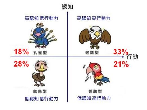 調查將家長分為四類,分別為老鷹型(佔33%)、孔雀型(18%)、鸚鵡型(21%)與鴕鳥型(28%),其中鴕鳥型同時具備低認知低行動力,為親子網安教育高風險群(圖片由Yahoo!奇摩提供)。