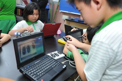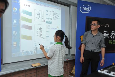 大湖國小也添購了電子白板,透過短焦距投影機及紅外線觸控功能,將電腦上的教學內容投影至大螢幕上,老師或學生可以即時在投影布幕上手寫註解,或是請學生上台示範。↓