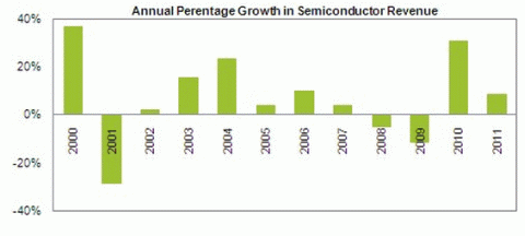 2000年的網路熱潮曾使當年半導體產業的成長率攀升至36.7%。不過,iSuppli強調,有別於當年的非理性繁榮,今年30.6%的晶片銷售成長是來自於過去12個月以來所逐漸累積的真實市場需求。