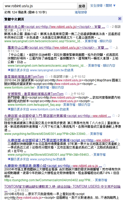 而iThome上午幾次實際在Google搜尋輸入「ww.robint.us/u.js」,則發現全球有約12萬多筆的網頁。而且顯然在這波攻擊裡,台灣或繁體中文的網站受影響的相當有限,搜尋結果都只有一百多個網頁。但裡面赫然發現TomTom及永慶房屋。不過這兩個網站問題可能已經修復,點選進去並無問題。蘇澳冷泉公園的某一網頁以Chrome瀏覽器連進去,則出現了網站受到感染的警訊。
