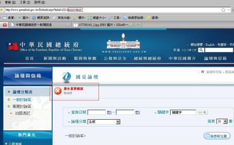 網友發現改版後新網站的國是論壇頁面可任意修改網址竄改網頁中紅色框起的內容,有心人士可以藉此惡作劇。