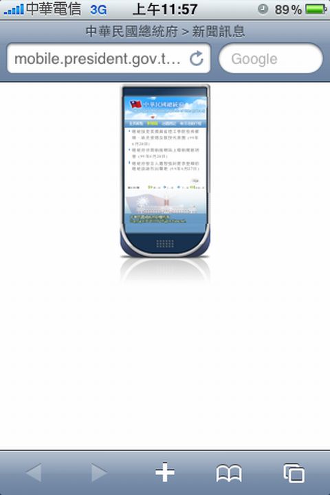 ↓下圖為熱心網友提供以iPhone連上手機版總統府網頁看到的內容,手機版網頁並未依手機螢幕調整頁面大小,留下週邊空白。