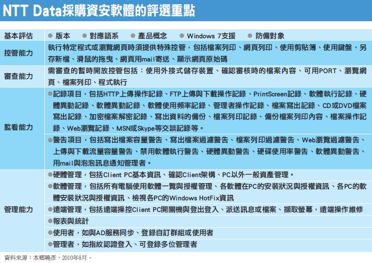 NTT Data除了比較軟體版本、產品概念、防備對象、支援語系和Windows 7支援度等基本評選項目外,還特別針對控管、審核、監看、管理等其他4大類比較條件來評估。例如控管類就包括了儲存裝置控管、硬體部分加密功能、HTTP上傳控管、FTP上下傳控管、離線控管、USB指定使用等項目。