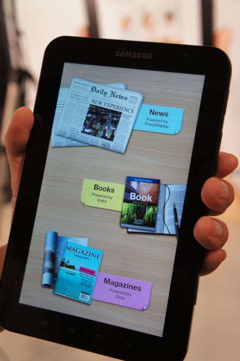 為了與蘋果軟體、硬體、服務整合的iPad競爭,三星為Galaxy Tab打造了一些平板電腦專屬應用,例如內建Reader Hub電子書閱讀軟體,可使用Kobo、PressDisplay、Zinio下載閱讀電子書、報紙或雜誌。三星宣稱三家服務商提供不同語言超過2百萬本書籍、2500種雜誌與1600種報紙,其中包括部份中文讀物,例如台灣的蘋果日報、China Post,三星計劃未來推出Galaxy Tab也會循手機的合作模式,引進遠流的電子書下載服務。