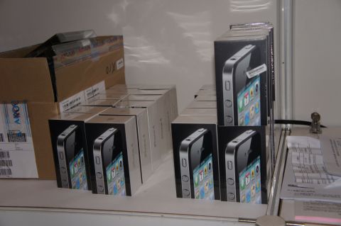 ↓首賣會後方等待賣出的iPhone 4。首賣規模較大的遠傳準備1千多支,台灣大哥大首賣規模較小,安排幾百支手機。